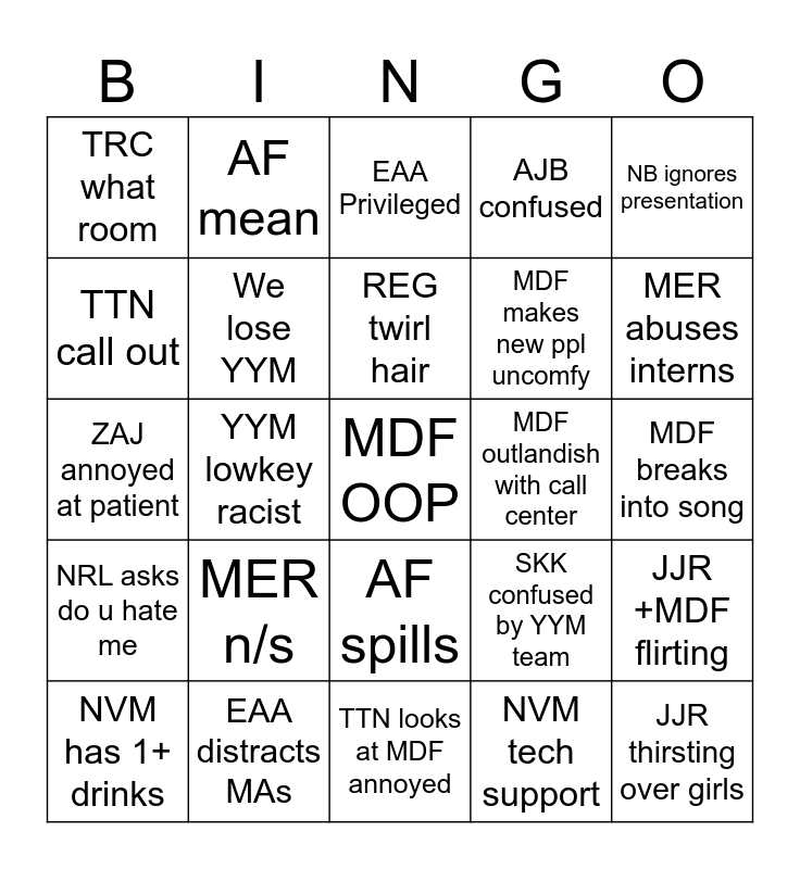 This bingo card has a free space and 38 words: JJR crash out, AF gets mad, TTN goes in pt room alone, We lose YYM, JJR +MDF flirting, MER n/s, REG twirl hair, NRL tells people to stfu, NB ignores presentation, MDF makes new ppl uncomfy, YYM lowkey racist, AJB confused, JJR thirsting over girls, MDF breaks into song, TTN call out, NRL asks do u hate me, AF indian, EAA Privileged, TTN says something maga, MDF outlandish with call center, TRC what room, EAA distracts MAs, MER abuses interns, NVM has 1+ drinks, CRR leaves a sip of coffee, TTN looks at MDF annoyed, stickers on back, AJB makes face, SN texts HEY...., NVM mad at op side for not texting, NVM here until 6, AF spills, NVM tech support, AF mean, LEM compared to MFM, SKK confused by YYM team, ZAJ annoyed at patient and MK tucks hair behind ears.