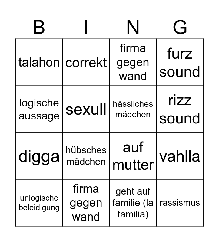 This bingo card has 23 words: rassismus, of, rizz sound, wird handgreiflich, logische aussage, talahon, sexull, correkt, unlogische beleidigung, redet eine andere sprache, hübsches mädchen, digga, gooner bild, furz sound, firma gegen wand, frauen feindlich, firma gegen wand, auf mutter, hässliches mädchen, vahlla, furz sound, geht auf familie (la familia) and fettes mädchen.