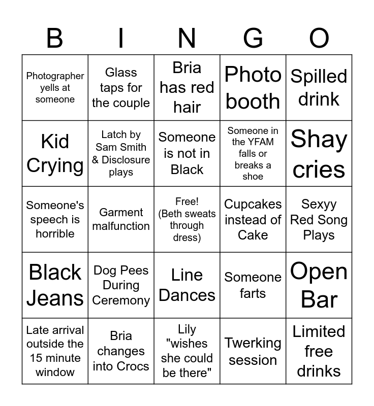 This bingo card has a free space and 24 words: Dog Pees During Ceremony, Bria changes into Crocs, Someone is not in Black, Late arrival outside the 15 minute window, Spilled drink, Photographer yells at someone, Kid Crying, Glass taps for the couple, Cupcakes instead of Cake, Line Dances, Someone in the YFAM falls or breaks a shoe, Someone's speech is horrible, Someone farts, Open Bar, Latch by Sam Smith & Disclosure plays, Twerking session, Sexyy Red Song Plays, Bria has red hair, Shay cries, Garment malfunction, Limited free drinks, Black Jeans, Photo booth and Lily "wishes she could be there".