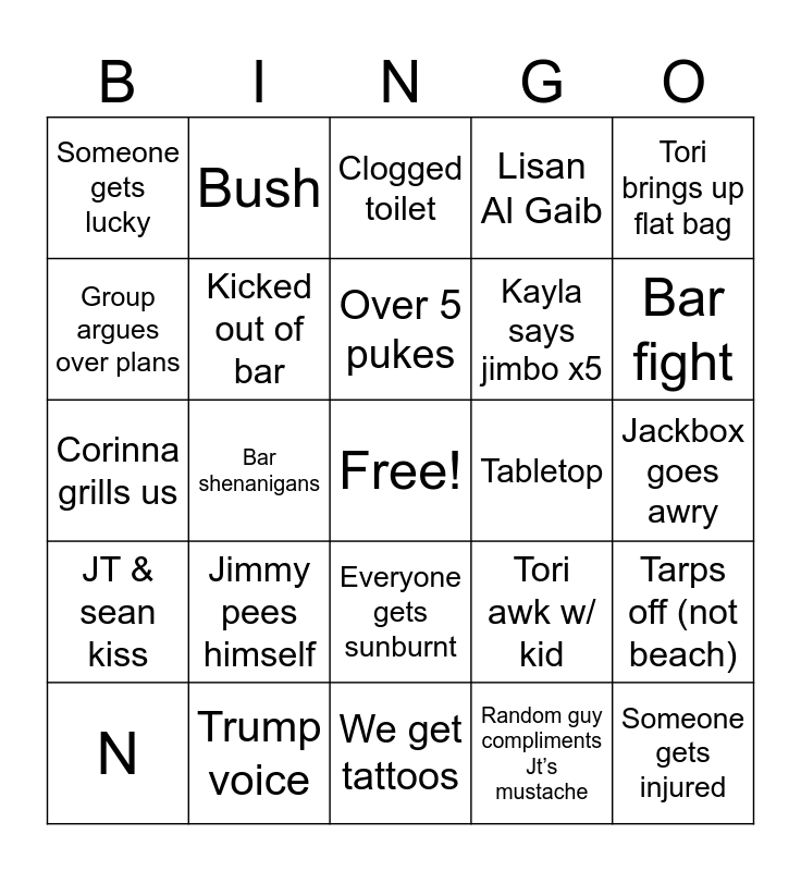 This bingo card has a free space and 24 words: Jimmy pees himself, Trump voice, Over 5 pukes, N, Tori brings up flat bag, Someone gets lucky, Group argues over plans, Bush, Tabletop, Everyone gets sunburnt, Kayla says jimbo x5, Corinna grills us, Tori awk w/ kid, Tarps off (not beach), Kicked out of bar, Random guy compliments Jt’s mustache, Jackbox goes awry, Clogged toilet, Bar fight, Bar shenanigans, Someone gets injured, JT & sean kiss, Lisan Al Gaib and We get tattoos.