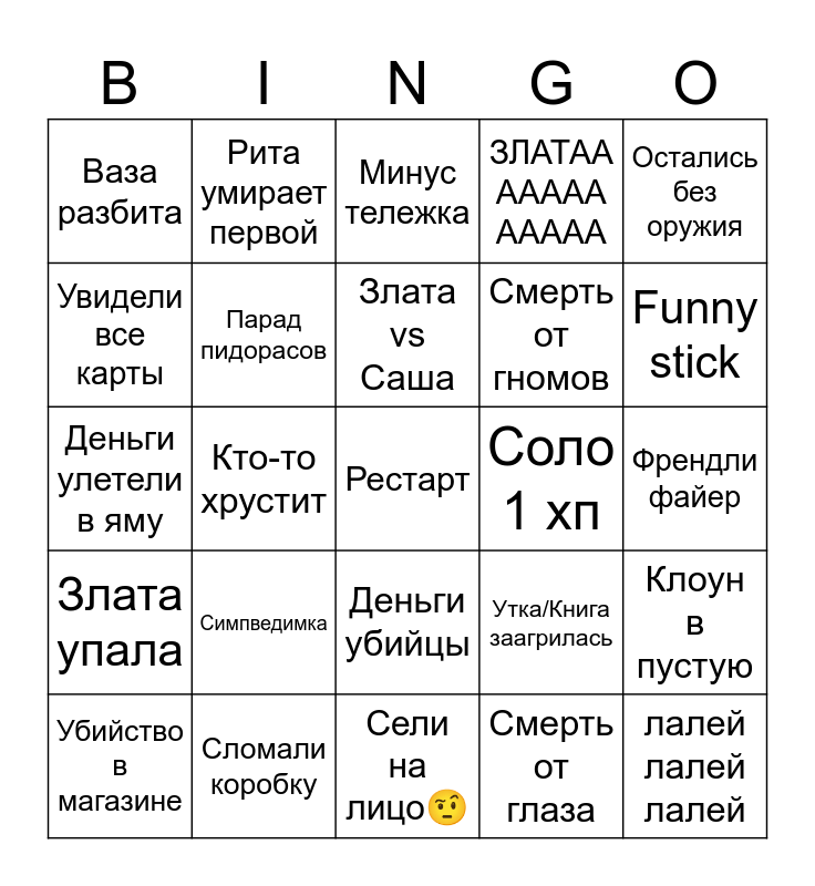 This bingo card has a free space and 24 words: Симпведимка, Сломали коробку, Злата vs Саша, Убийство в магазине, Остались без оружия, Ваза разбита, Увидели все карты, Рита умирает первой, Соло 1 хп, Деньги убийцы, Смерть от гномов, Деньги улетели в яму, Утка/Книга заагрилась, Клоун в пустую, Парад пидорасов, Смерть от глаза, Френдли файер, Минус тележка, Funny stick, Кто-то хрустит, лалей лалей лалей, Злата упала, ЗЛАТАА ААААА ААААА and Сели на лицо🤨.