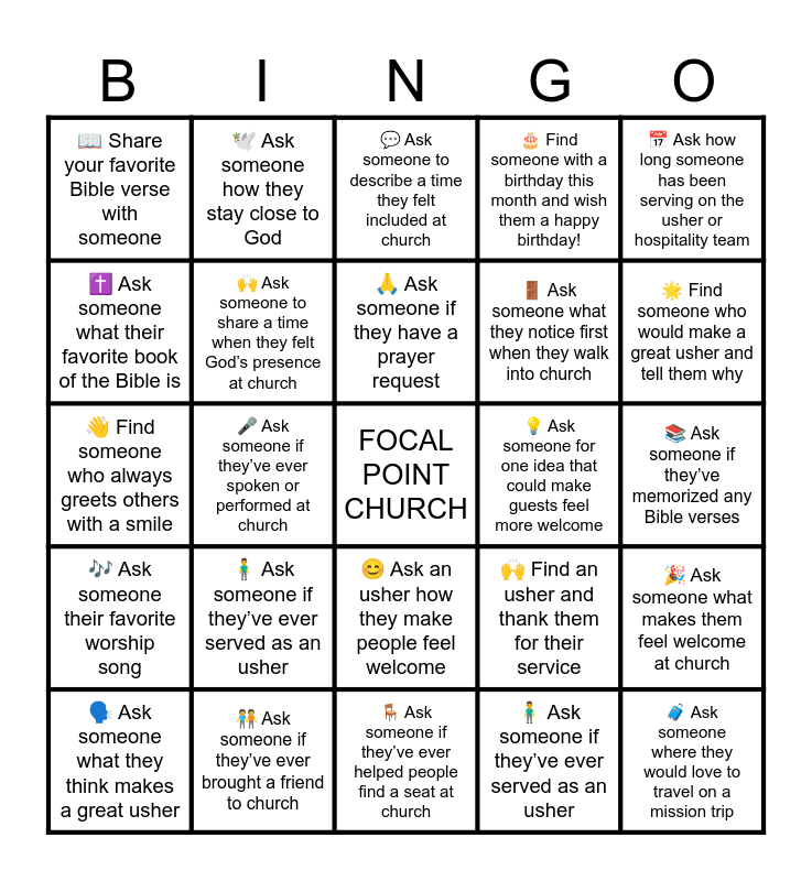 This bingo card has a free space and 25 words: π§ββοΈ Ask someone if theyβve ever served as an usher, πͺ Ask someone if theyβve ever helped people find a seat at church, π Ask someone if they have a prayer request, π£οΈ Ask someone what they think makes a great usher, π Ask how long someone has been serving on the usher or hospitality team, π Share your favorite Bible verse with someone, βοΈ Ask someone what their favorite book of the Bible is, π Ask someone how they stay close to God, π‘ Ask someone for one idea that could make guests feel more welcome, π Ask an usher how they make people feel welcome, πͺ Ask someone what they notice first when they walk into church, π Find someone who always greets others with a smile, π Find an usher and thank them for their service, π Ask someone what makes them feel welcome at church, π Ask someone to share a time when they felt Godβs presence at church, π§‘ Give someone a genuine compliment, π Ask someone if theyβve memorized any Bible verses, π¬ Ask someone to describe a time they felt included at church, π Find someone who would make a great usher and tell them why, π€ Ask someone if theyβve ever spoken or performed at church, π§³ Ask someone where they would love to travel on a mission trip, π§βπ€βπ§ Ask someone if theyβve ever brought a friend to church, πΆ Ask someone their favorite worship song, π Find someone with a birthday this month and wish them a happy birthday! and π§ββοΈ Ask someone if theyβve ever served as an usher.