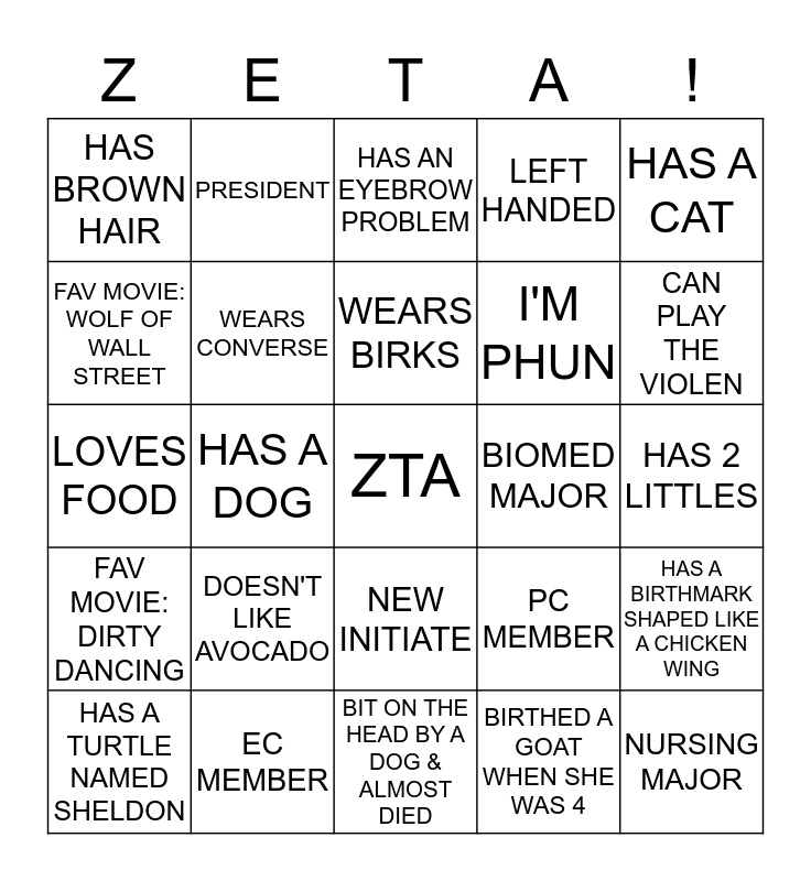 This bingo card has a free space and 24 words: DOESN'T LIKE AVOCADO, EC MEMBER, WEARS BIRKS, HAS A TURTLE NAMED SHELDON, HAS A CAT, HAS BROWN HAIR, FAV MOVIE: WOLF OF WALL STREET, PRESIDENT, BIOMED MAJOR, NEW INITIATE, I'M PHUN, LOVES FOOD, PC MEMBER, HAS A BIRTHMARK SHAPED LIKE A CHICKEN WING, WEARS CONVERSE, BIRTHED A GOAT WHEN SHE WAS 4, HAS 2 LITTLES, HAS AN EYEBROW PROBLEM, CAN PLAY THE VIOLEN, HAS A DOG, NURSING MAJOR, FAV MOVIE: DIRTY DANCING, LEFT HANDED and BIT ON THE HEAD BY A DOG & ALMOST DIED.