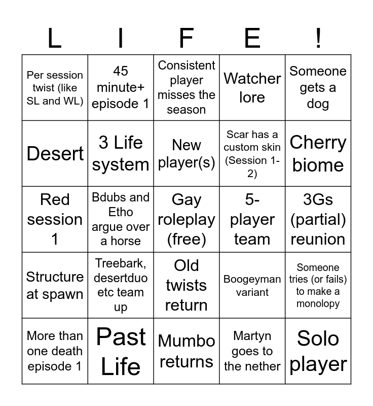 This bingo card has a free space and 24 words: Treebark, desertduo etc team up, Past Life, New player(s), More than one death episode 1, Someone gets a dog, Per session twist (like SL and WL), Desert, 45 minute+ episode 1, 5-player team, Old twists return, Scar has a custom skin (Session 1-2), Red session 1, Boogeyman variant, Someone tries (or fails) to make a monolopy, 3 Life system, Martyn goes to the nether, 3Gs (partial) reunion, Consistent player misses the season, Cherry biome, Bdubs and Etho argue over a horse, Solo player, Structure at spawn, Watcher lore and Mumbo returns.