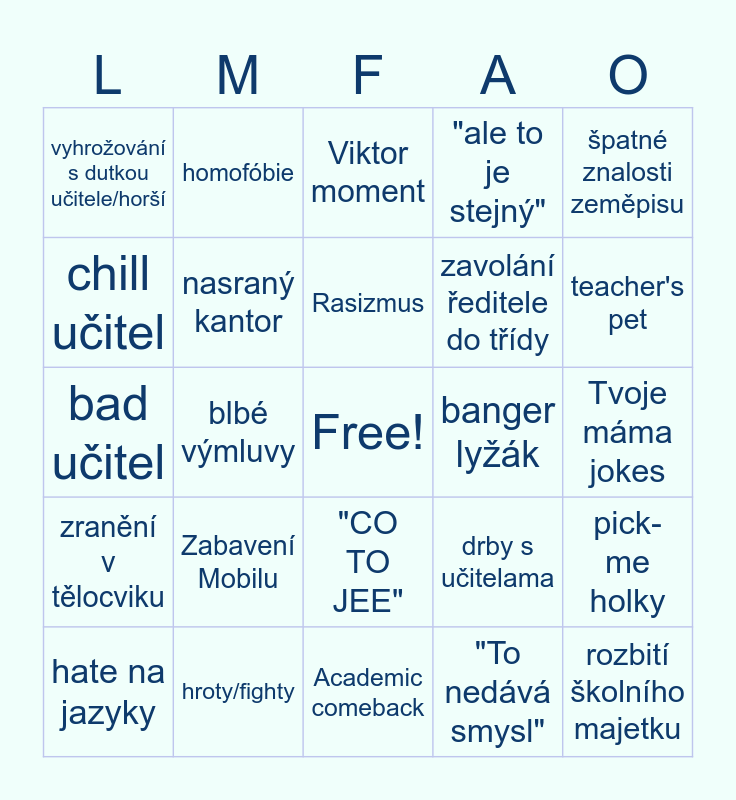 This bingo card has a free space and 24 words: Zabavení Mobilu, hroty/fighty, Rasizmus, hate na jazyky, špatné znalosti zeměpisu, vyhrožování s dutkou učitele/horší, chill učitel, homofóbie, banger lyžák, "CO TO JEE", zavolání ředitele do třídy, bad učitel, drby s učitelama, pick-me holky, nasraný kantor, "To nedává smysl", Tvoje máma jokes, Viktor moment, teacher's pet, blbé výmluvy, rozbití školního majetku, zranění v tělocviku, "ale to je stejný" and Academic comeback.