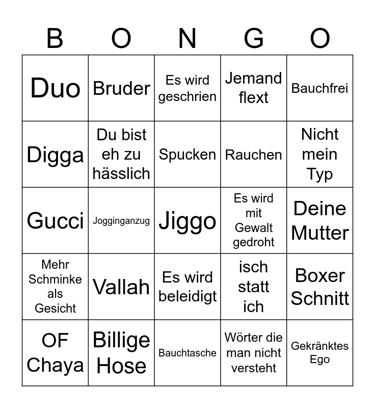 This bingo card has a free space and 24 words: Vallah, Billige Hose, Spucken, OF Chaya, Bauchfrei, Duo, Digga, Bruder, Es wird mit Gewalt gedroht, Es wird beleidigt, Rauchen, Gucci, isch statt ich, Boxer Schnitt, Du bist eh zu hässlich, Wörter die man nicht versteht, Deine Mutter, Es wird geschrien, Nicht mein Typ, Jogginganzug, Gekränktes Ego, Mehr Schminke als Gesicht, Jemand flext and Bauchtasche.