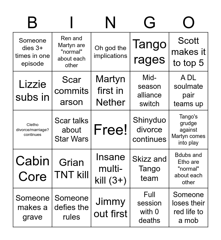 This bingo card has a free space and 49 words: Scott doesn't make it to top 5, Someone loses their red life to a mob, Scar is first to die, Jimmy out first, Grian TNT kill, Grian kills an ally, Ren and Martyn are "normal" about each other, A non-lifer subs in, Lizzie subs in, Oli OrionSound cameo, Scar commits arson, Tango rages, Bdubs and Etho are "normal" about each other, Skizz and Tango team, Ren and Martyn team, BigB doesn't team with anyone ep1, Martyn first in Nether, Shinyduo divorce continues, Scar and Grian team, Scott makes it to top 5, Scar talks about Star Wars, Full session with 0 deaths, Someone dies 3+ times in one episode, Mid-season alliance switch, Vicious Betrayal, A DL soulmate pair teams up, Someone makes a grave, People don't trust Scar, Insane multi-kill (3+), Cabin Core, Martyn does a lore (in session), Scar does a lore (in session), Letter crew team (TIES, BEST, etc), Scar does a scam, Someone defies the rules, Wither summoned, Warden brought to surface, There isn't a straight explanation for this, Tango's grudge against Martyn comes into play, Joel's grudge against Scott comes into play, Entire server bands together to kill Scott, Multiple of someone's traps fail in one episode, Someone falls for their own trap, Horrid innuendo somehow made it into episode, Cletho divorce/marriage? continues, Oh god the implications, Two Nickels joke, Mumbo lives to the final episode and Bdubs gets a clock.
