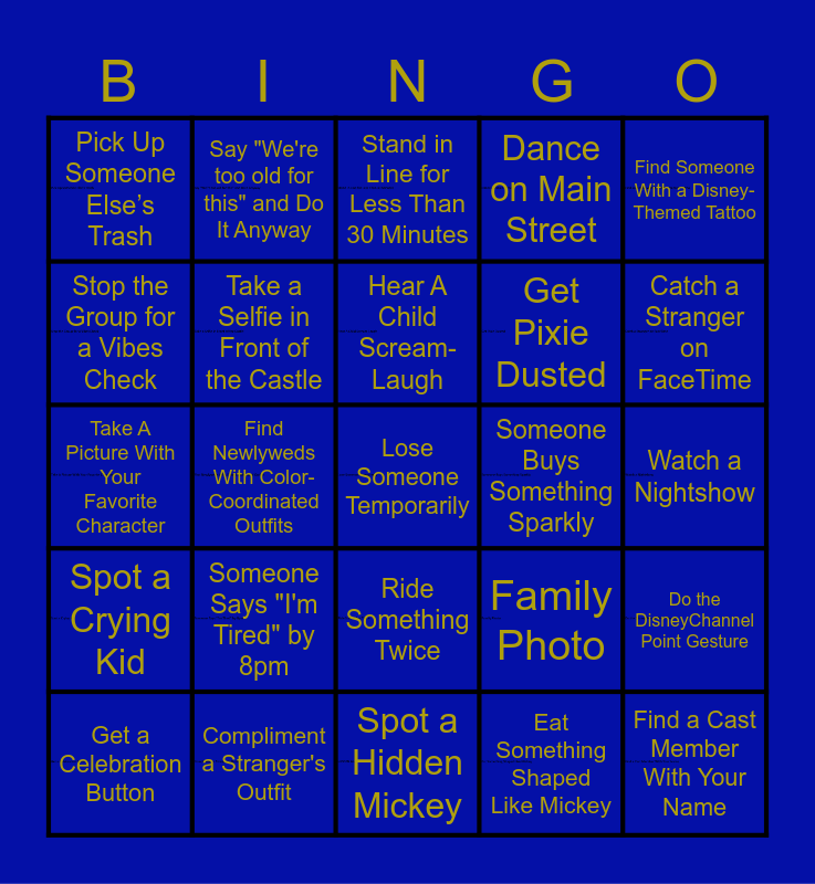 This bingo card has 25 images and 25 words: Spot a Crying Kid, Compliment a Stranger's Outfit, Lose Someone Temporarily, Eat Something Shaped Like Mickey, Find Someone With a Disney-Themed Tattoo, Pick Up Someone Else’s Trash, Say "We're too old for this" and Do It Anyway, Stand in Line for Less Than 30 Minutes, Someone Buys Something Sparkly, Do the DisneyChannel Point Gesture, Stop the Group for a Vibes Check, Take a Selfie in Front of the Castle, Spot a Hidden Mickey, Family Photo, Catch a Stranger on FaceTime, Get a Celebration Button, Find Newlyweds With Color-Coordinated Outfits, Hear A Child Scream-Laugh, Get Pixie Dusted, Watch a Nightshow, Take A Picture With Your Favorite Character, Someone Says "I'm Tired" by 8pm, Ride Something Twice, Dance on Main Street and Find a Cast Member With Your Name.
