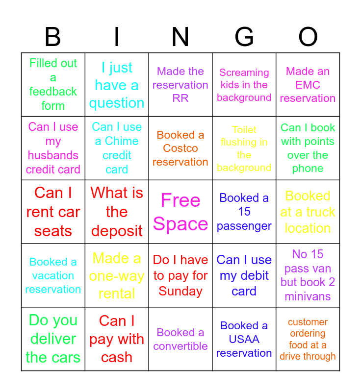 This bingo card has a free space and 24 words: Made a one-way rental, Can I pay with cash, Booked a Costco reservation, Do you deliver the cars, Made an EMC reservation, Filled out a feedback form, Can I use my husbands credit card, I just have a question, Booked a 15 passenger, Do I have to pay for Sunday, Toilet flushing in the background, Can I rent car seats, Can I use my debit card, No 15 pass van but book 2 minivans, Can I use a Chime credit card, Booked a USAA reservation, Booked at a truck location, Made the reservation RR, Can I book with points over the phone, What is the deposit, customer ordering food at a drive through, Booked a vacation reservation, Screaming kids in the background and Booked a convertible.