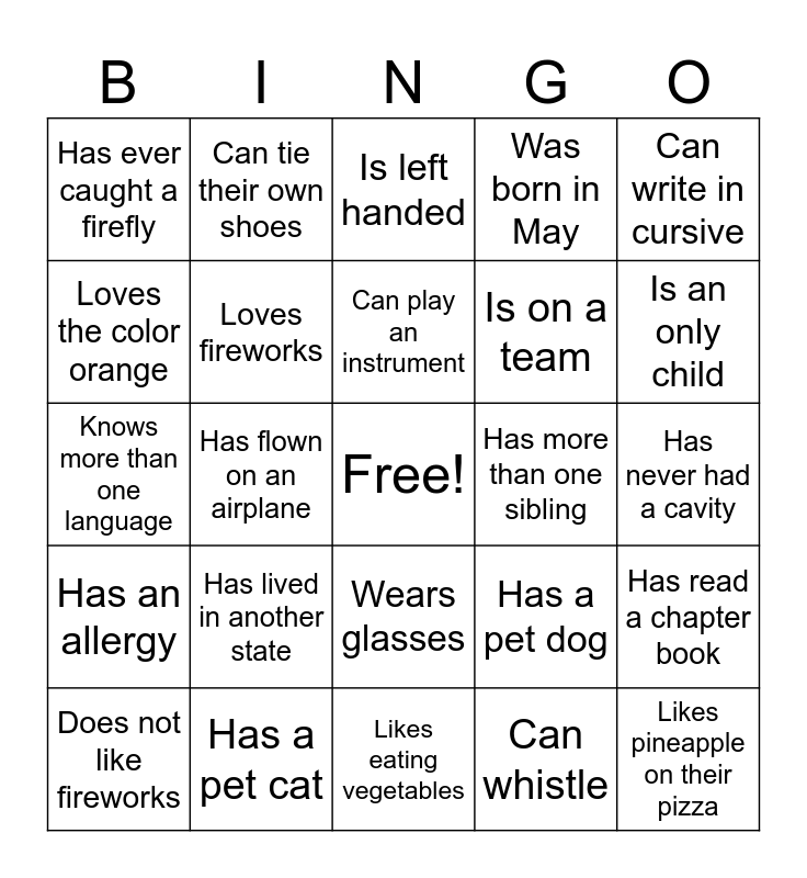 This bingo card has a free space and 24 words: Has lived in another state, Has a pet cat, Can play an instrument, Does not like fireworks, Can write in cursive, Has ever caught a firefly, Loves the color orange, Can tie their own shoes, Has more than one sibling, Wears glasses, Is on a team, Knows more than one language, Has a pet dog, Has read a chapter book, Loves fireworks, Can whistle, Has never had a cavity, Is left handed, Is an only child, Has flown on an airplane, Likes pineapple on their pizza, Has an allergy, Was born in May and Likes eating vegetables.