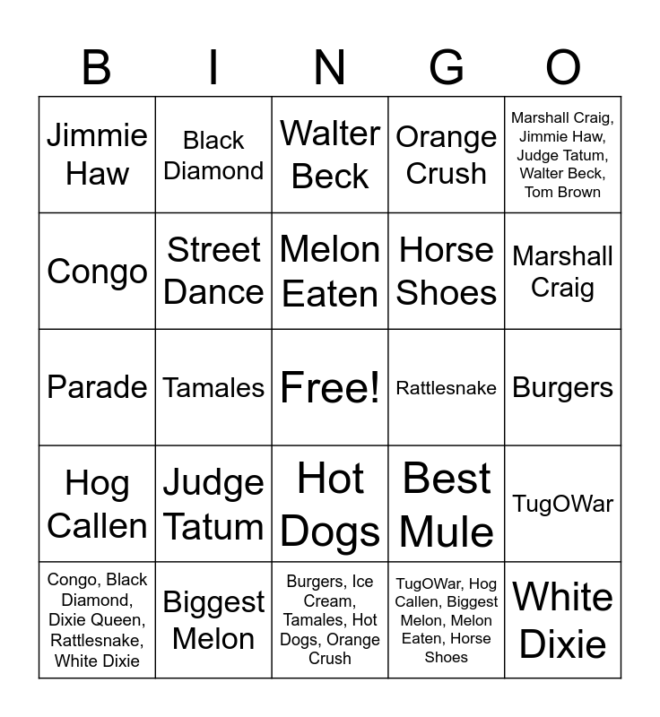 This bingo card has a free space and 29 words: Congo, Black Diamond, Dixie Queen, Rattlesnake, White Dixie, Parade, Street Dance, Queen Contest, Best Mule, BINGO, Burgers, Ice Cream, Tamales, Hot Dogs, Orange Crush, TugOWar, Hog Callen, Biggest Melon, Melon Eaten, Horse Shoes, Marshall Craig, Jimmie Haw, Judge Tatum, Walter Beck, Tom Brown, Congo, Black Diamond, Dixie Queen, Rattlesnake, White Dixie, Parade, Street Dance, Queen Contest, Best Mule, Burgers, Ice Cream, Tamales, Hot Dogs, Orange Crush, TugOWar, Hog Callen, Biggest Melon, Melon Eaten, Horse Shoes, Marshall Craig, Jimmie Haw, Judge Tatum, Walter Beck and Tom Brown.