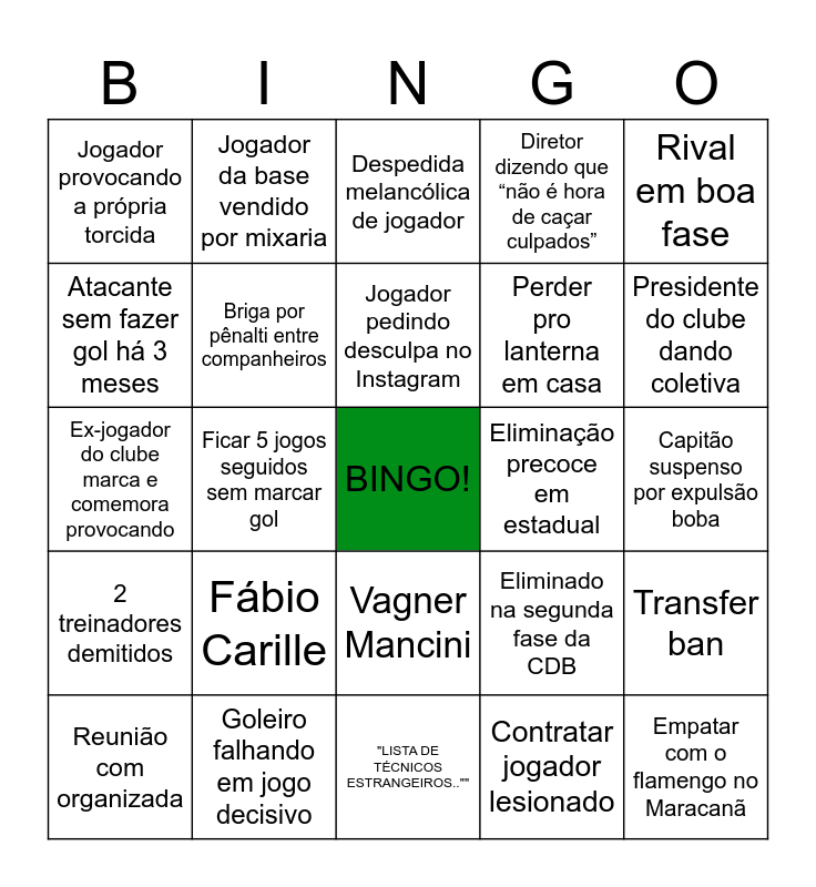 This bingo card has a free space and 24 words: Fábio Carille, Goleiro falhando em jogo decisivo, Jogador pedindo desculpa no Instagram, Reunião com organizada, Rival em boa fase, Jogador provocando a própria torcida, Atacante sem fazer gol há 3 meses, Jogador da base vendido por mixaria, Eliminação precoce em estadual, Vagner Mancini, Perder pro lanterna em casa, Ex-jogador do clube marca e comemora provocando, Eliminado na segunda fase da CDB, Transfer ban, Briga por pênalti entre companheiros, Contratar jogador lesionado, Capitão suspenso por expulsão boba, Despedida melancólica de jogador, Presidente do clube dando coletiva, Ficar 5 jogos seguidos sem marcar gol, Empatar com o flamengo no Maracanã, 2 treinadores demitidos, Diretor dizendo que “não é hora de caçar culpados” and "LISTA DE TÉCNICOS ESTRANGEIROS.."".