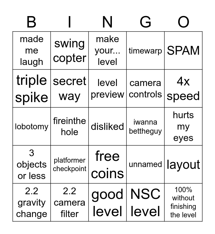 This bingo card has a free space and 24 words: platformer checkpoint, 2.2 camera filter, level preview, 2.2 gravity change, SPAM, made me laugh, triple spike, swing copter, iwanna bettheguy, free coins, camera controls, lobotomy, unnamed, layout, secret way, NSC level, hurts my eyes, make your... level, 4x speed, fireinthe hole, 100% without finishing the level, 3 objects or less, timewarp and good level.