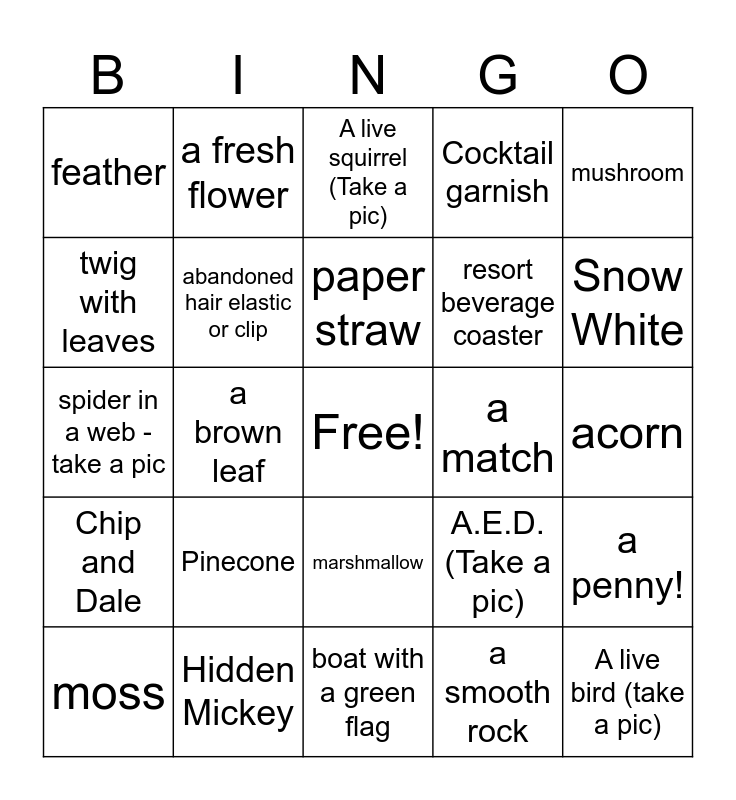 This bingo card has a free space and 24 words: Pinecone, Hidden Mickey, paper straw, moss, mushroom, feather, twig with leaves, a fresh flower, a match, marshmallow, resort beverage coaster, spider in a web - take a pic, A.E.D. (Take a pic), a penny!, abandoned hair elastic or clip, a smooth rock, acorn, A live squirrel (Take a pic), Snow White, a brown leaf, A live bird (take a pic), Chip and Dale, Cocktail garnish and boat with a green flag.