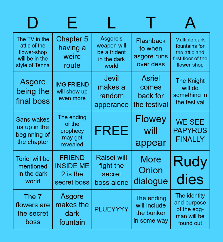 This bingo card has a free space and 24 words: FRIEND INSIDE ME 2 is the secret boss, Asgore makes the dark fountain, Jevil makes a random apperance, The 7 flowers are the secret boss, Multiple dark fountains for the attic and first floor of the flower-shop, The TV in the attic of the flower-shop will be in the style of Tenna, Asgore being the final boss, Chapter 5 having a weird route, Flowey will appear, Ralsei will fight the secret boss alone, Asriel comes back for the festival, Sans wakes us up in the beginning of the chapter, More Onion dialogue, Rudy dies, IMG.FRIEND will show up even more, The ending will include the bunker in some way, WE SEE PAPYRUS FINALLY, Asgore's weapon will be a trident in the dark world, The Knight will do something in the festival, The ending of the prophecy may get revealed, The identity and purpose of the egg-man will be found out, Toriel will be mentioned in the dark world, Flashback to when asgore runs over dess and PLUEYYYY.
