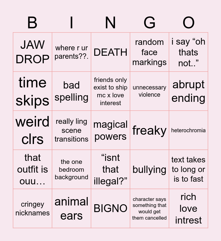This bingo card has 25 words: that outfit is ouu…, animal ears, magical powers, character says something that would get them cancelled, i say “oh thats not..”, JAW DROP, where r ur parents??., DEATH, freaky, text takes to long or is to fast, time skips, bad spelling, BIGNO, bullying, abrupt ending, cringey nicknames, really ling scene transitions, friends only exist to ship mc x love interest, unnecessary violence, heterochromia, weird clrs, the one bedroom background, “isnt that illegal?”, random face markings and rich love intrest.