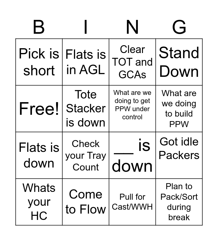 This bingo card has 16 words: Come to Flow, Got idle Packers, Clear TOT and GCAs, Pick is short, Flats is down, Flats is in AGL, __ is down, Pull for Cast/WWH, Free!, Tote Stacker is down, Whats your HC, Stand Down, Check your Tray Count, What are we doing to build PPW, What are we doing to get PPW under control and Plan to Pack/Sort during break.
