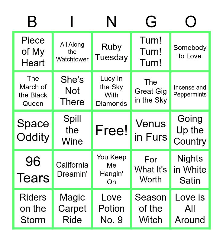 This bingo card has a free space and 24 words: California Dreamin', Magic Carpet Ride, Lucy In the Sky With Diamonds, Riders on the Storm, Somebody to Love, Piece of My Heart, The March of the Black Queen, All Along the Watchtower, Venus in Furs, You Keep Me Hangin' On, The Great Gig in the Sky, Space Oddity, For What It's Worth, Nights in White Satin, She's Not There, Season of the Witch, Going Up the Country, Ruby Tuesday, Incense and Peppermints, Spill the Wine, Love is All Around, 96 Tears, Turn! Turn! Turn! and Love Potion No. 9.