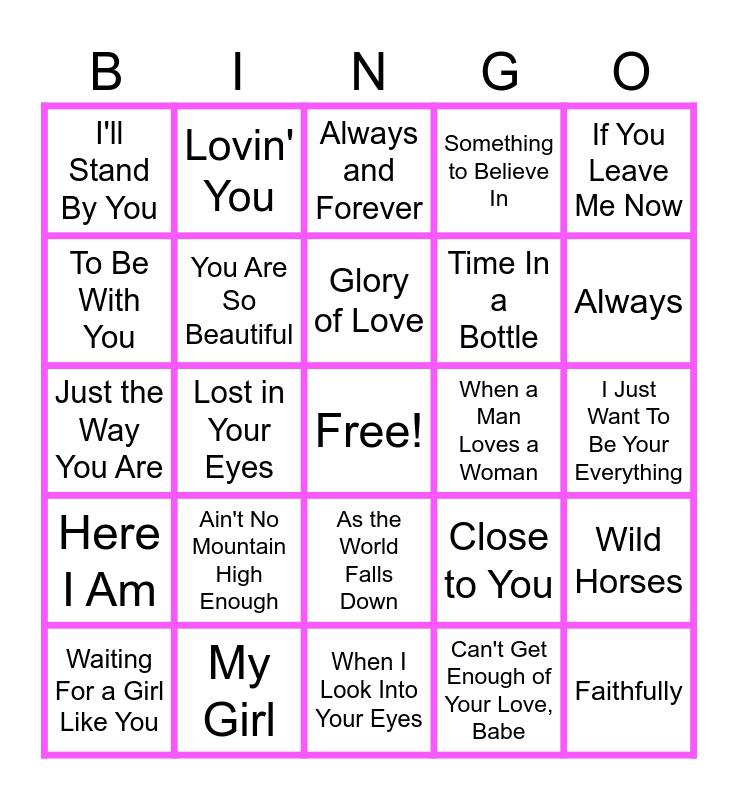 This bingo card has a free space and 24 words: Ain't No Mountain High Enough, My Girl, Glory of Love, Waiting For a Girl Like You, If You Leave Me Now, I'll Stand By You, To Be With You, Lovin' You, When a Man Loves a Woman, As the World Falls Down, Time In a Bottle, Just the Way You Are, Close to You, Wild Horses, You Are So Beautiful, Can't Get Enough of Your Love, Babe, I Just Want To Be Your Everything, Always and Forever, Always, Lost in Your Eyes, Faithfully, Here I Am, Something to Believe In and When I Look Into Your Eyes.
