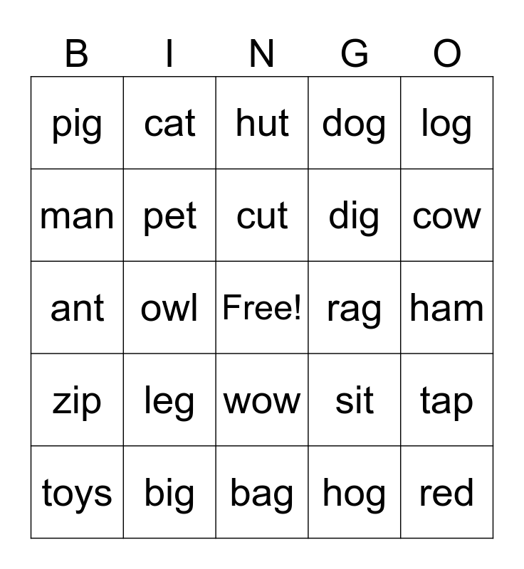 This bingo card has a free space and 24 words: leg, big, cut, toys, log, pig, man, cat, rag, wow, dig, ant, sit, tap, pet, hog, ham, hut, cow, owl, red, zip, dog and bag.