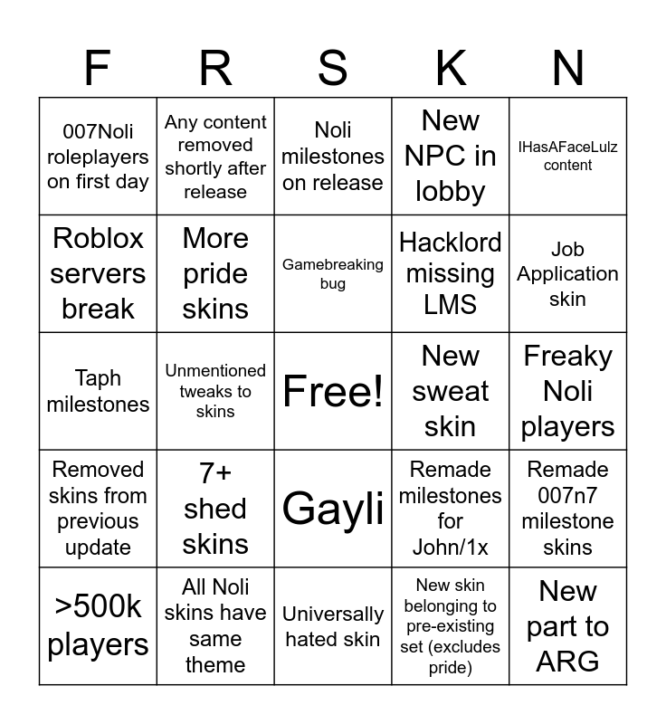 This bingo card has a free space and 24 words: 7+ shed skins, All Noli skins have same theme, Gamebreaking bug, >500k players, IHasAFaceLulz content, 007Noli roleplayers on first day, Roblox servers break, Any content removed shortly after release, New sweat skin, Gayli, Hacklord missing LMS, Taph milestones, Remade milestones for John/1x, Remade 007n7 milestone skins, More pride skins, New skin belonging to pre-existing set (excludes pride), Freaky Noli players, Noli milestones on release, Job Application skin, Unmentioned tweaks to skins, New part to ARG, Removed skins from previous update, New NPC in lobby and Universally hated skin.
