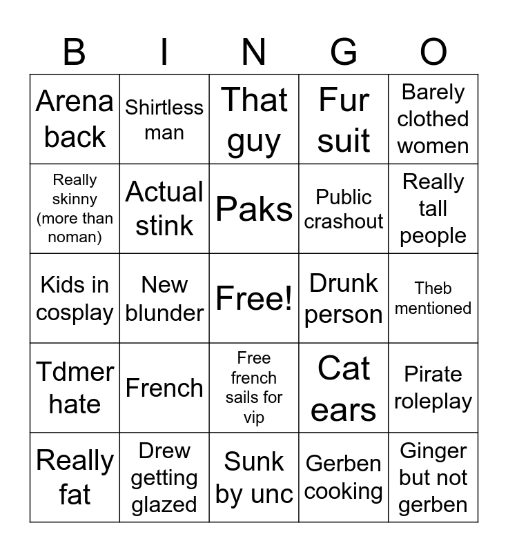 This bingo card has a free space and 24 words: Really fat, French, Paks, Gerben cooking, Barely clothed women, Arena back, Shirtless man, That guy, Drunk person, Theb mentioned, Kids in cosplay, Actual stink, Cat ears, Pirate roleplay, Really skinny (more than noman), Drew getting glazed, Sunk by unc, Fur suit, Really tall people, Tdmer hate, New blunder, Free french sails for vip, Public crashout and Ginger but not gerben.