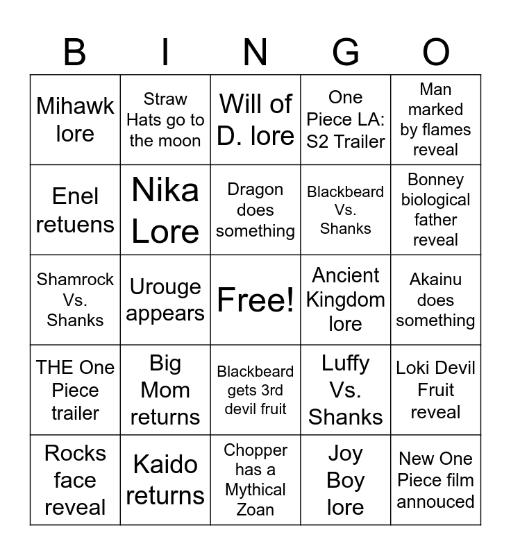 This bingo card has a free space and 24 words: Big Mom returns, Kaido returns, Dragon does something, Rocks face reveal, Man marked by flames reveal, Mihawk lore, Enel retuens, Straw Hats go to the moon, Ancient Kingdom lore, Blackbeard gets 3rd devil fruit, Blackbeard Vs. Shanks, Shamrock Vs. Shanks, Luffy Vs. Shanks, Loki Devil Fruit reveal, Nika Lore, Joy Boy lore, Akainu does something, Will of D. lore, Bonney biological father reveal, Urouge appears, New One Piece film annouced, THE One Piece trailer, One Piece LA: S2 Trailer and Chopper has a Mythical Zoan.