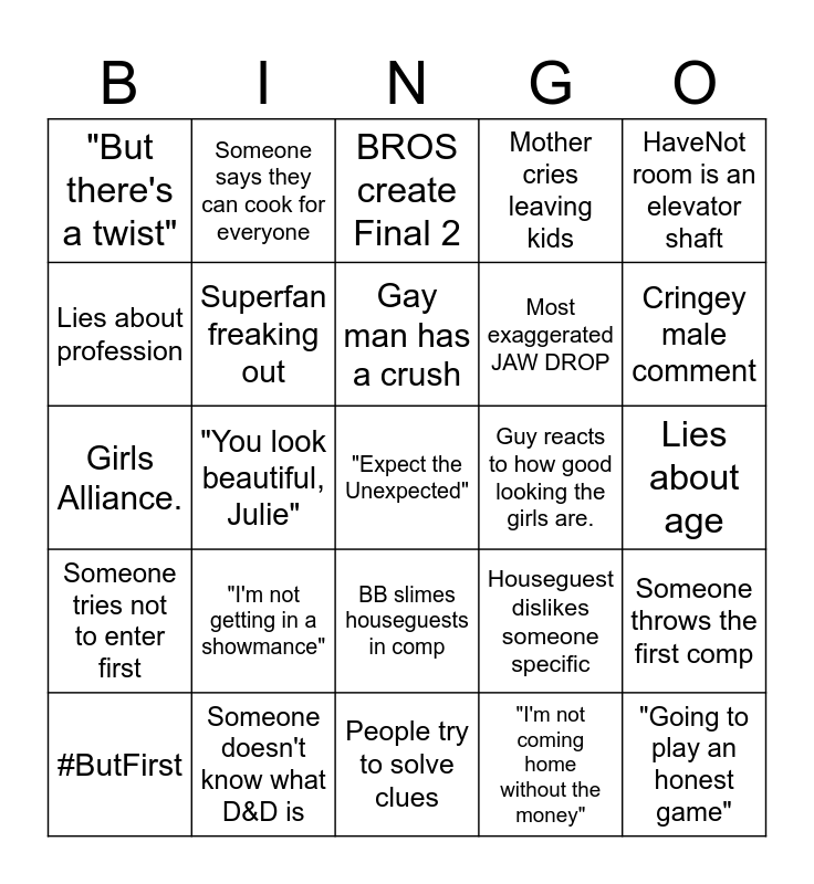 This bingo card has a free space and 24 words: "I'm not getting in a showmance", Someone doesn't know what D&D is, Gay man has a crush, #ButFirst, HaveNot room is an elevator shaft, "But there's a twist", Lies about profession, Someone says they can cook for everyone, Guy reacts to how good looking the girls are., BB slimes houseguests in comp, Most exaggerated JAW DROP, Girls Alliance., Houseguest dislikes someone specific, Someone throws the first comp, Superfan freaking out, "I'm not coming home without the money", Lies about age, BROS create Final 2, Cringey male comment, "You look beautiful, Julie", "Going to play an honest game", Someone tries not to enter first, Mother cries leaving kids and People try to solve clues.