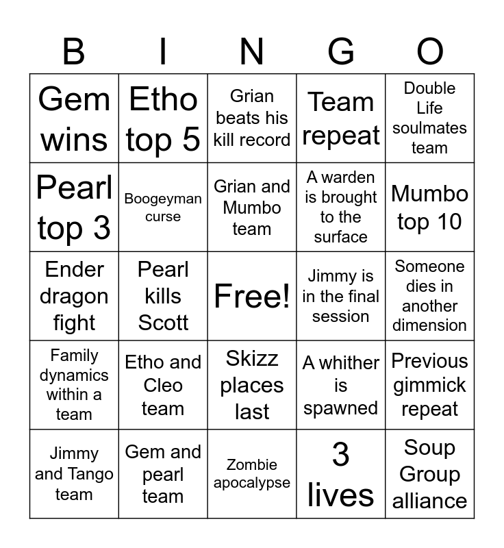 This bingo card has a free space and 24 words: Etho and Cleo team, Gem and pearl team, Grian and Mumbo team, Jimmy and Tango team, Double Life soulmates team, Gem wins, Pearl top 3, Etho top 5, Jimmy is in the final session, Skizz places last, A warden is brought to the surface, Ender dragon fight, A whither is spawned, Previous gimmick repeat, Boogeyman curse, 3 lives, Someone dies in another dimension, Grian beats his kill record, Mumbo top 10, Pearl kills Scott, Soup Group alliance, Family dynamics within a team, Team repeat and Zombie apocalypse.