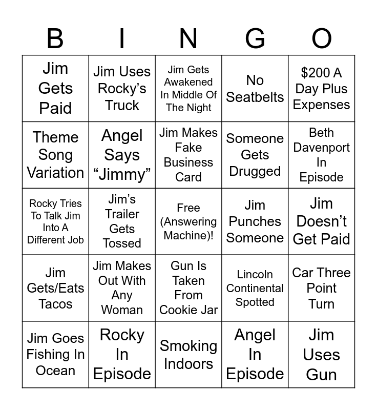 This bingo card has a free space and 34 words: Jim Gets Knocked Out, Angel In Episode, Car Chase, Jim Uses Word Gorilla, Jim Gets/Eats Tacos, Angel Says “Jimmy”, $200 A Day Plus Expenses, Jim Goes Fishing In Ocean, Jim Uses Rocky’s Truck, Jim Calls Dennis Becker, Jim Makes Fake Business Card, Jim Gets Awakened In Middle Of The Night, Jim Impersonates Someone Else, Jim Gets Punched, Jim Punches Someone, Beth Davenport In Episode, Rocky In Episode, Rocky Tries To Talk Jim Into A Different Job, Jim Makes Out With Any Woman, Lincoln Continental Spotted, Gun Is Taken From Cookie Jar, Jim’s Car Is Tampered With/Breaks Down, Jim Gets Paid, Jim Doesn’t Get Paid, Smoking Indoors, Jim Uses Gun, No Seatbelts, Jim Uses Payphone, Someone Gets Drugged, Theme Song Variation, Jim Accused Of Murder, Jim’s Trailer Gets Tossed, Car Three Point Turn and Famous Guest Star In Episodes.