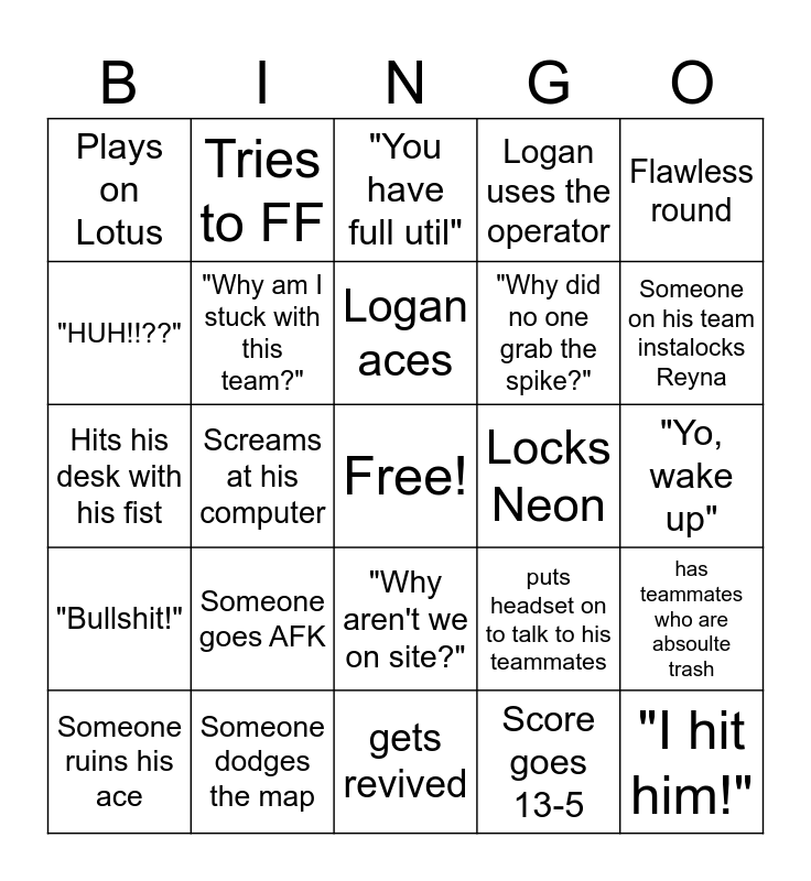 This bingo card has a free space and 24 words: Someone goes AFK, Someone dodges the map, Logan aces, Someone ruins his ace, Flawless round, Plays on Lotus, "HUH!!??", Tries to FF, Locks Neon, "Why aren't we on site?", "Why did no one grab the spike?", Hits his desk with his fist, puts headset on to talk to his teammates, has teammates who are absoulte trash, "Why am I stuck with this team?", Score goes 13-5, "Yo, wake up", "You have full util", Someone on his team instalocks Reyna, Screams at his computer, "I hit him!", "Bullshit!", Logan uses the operator and gets revived.