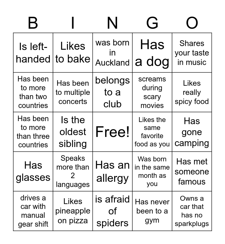 This bingo card has a free space and 24 words: Speaks more than 2 languages, Likes pineapple on pizza, belongs to a club, drives a car with manual gear shift, Shares your taste in music, Is left-handed, Has been to more than two countries, Likes to bake, Likes the same favorite food as you, Has an allergy, screams during scary movies, Has been to more than three countries, Was born in the same month as you, Has met someone famous, Has been to multiple concerts, Has never been to a gym, Has gone camping, was born in Auckland, Likes really spicy food, Is the oldest sibling, Owns a car that has no sparkplugs, Has glasses, Has a dog and is afraid of spiders.