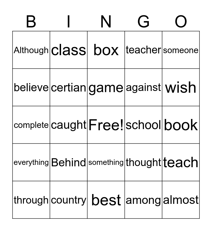 This bingo card has a free space and 24 words: Behind, country, game, through, someone, Although, believe, class, school, something, against, complete, thought, teach, certian, among, book, box, wish, caught, almost, everything, teacher and best.