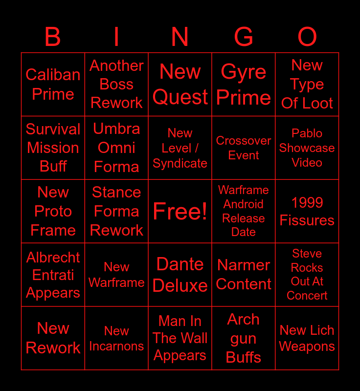 This bingo card has a free space and 24 words: New Warframe, New Incarnons, New Level / Syndicate, New Rework, New Type Of Loot, Caliban Prime, Survival Mission Buff, Another Boss Rework, Warframe Android Release Date, Dante Deluxe, Crossover Event, New Proto Frame, Narmer Content, Steve Rocks Out At Concert, Umbra Omni Forma, Arch gun Buffs, 1999 Fissures, New Quest, Pablo Showcase Video, Stance Forma Rework, New Lich Weapons, Albrecht Entrati Appears, Gyre Prime and Man In The Wall Appears.