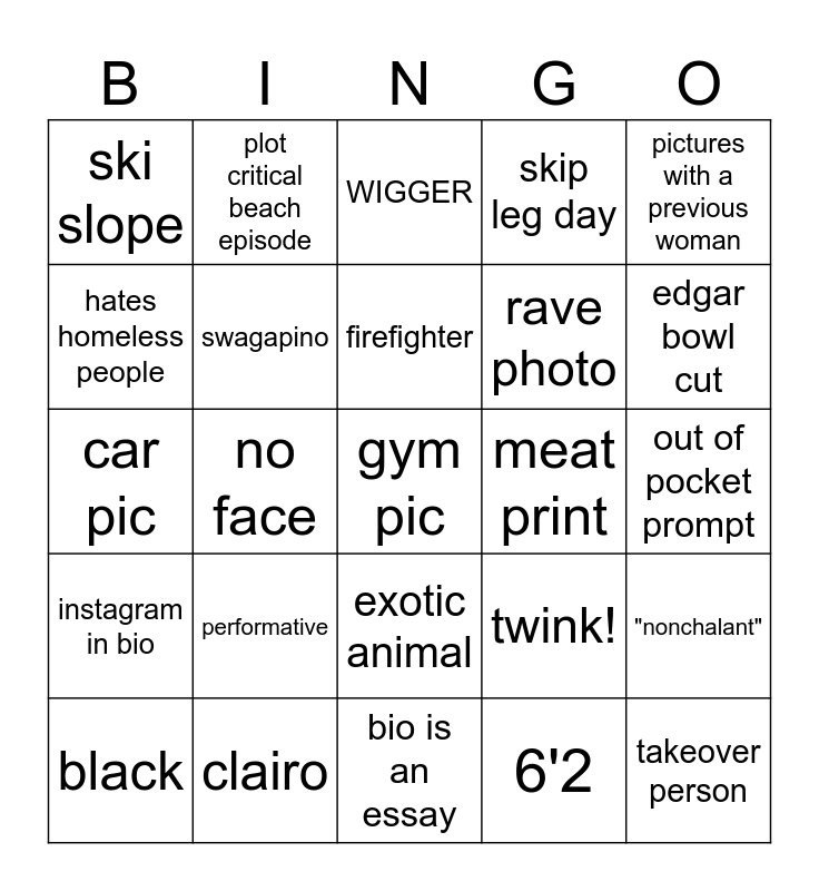 This bingo card has a free space and 24 words: performative, clairo, firefighter, black, pictures with a previous woman, ski slope, hates homeless people, plot critical beach episode, meat print, exotic animal, rave photo, car pic, twink!, "nonchalant", swagapino, 6'2, out of pocket prompt, WIGGER, edgar bowl cut, no face, takeover person, instagram in bio, skip leg day and bio is an essay.