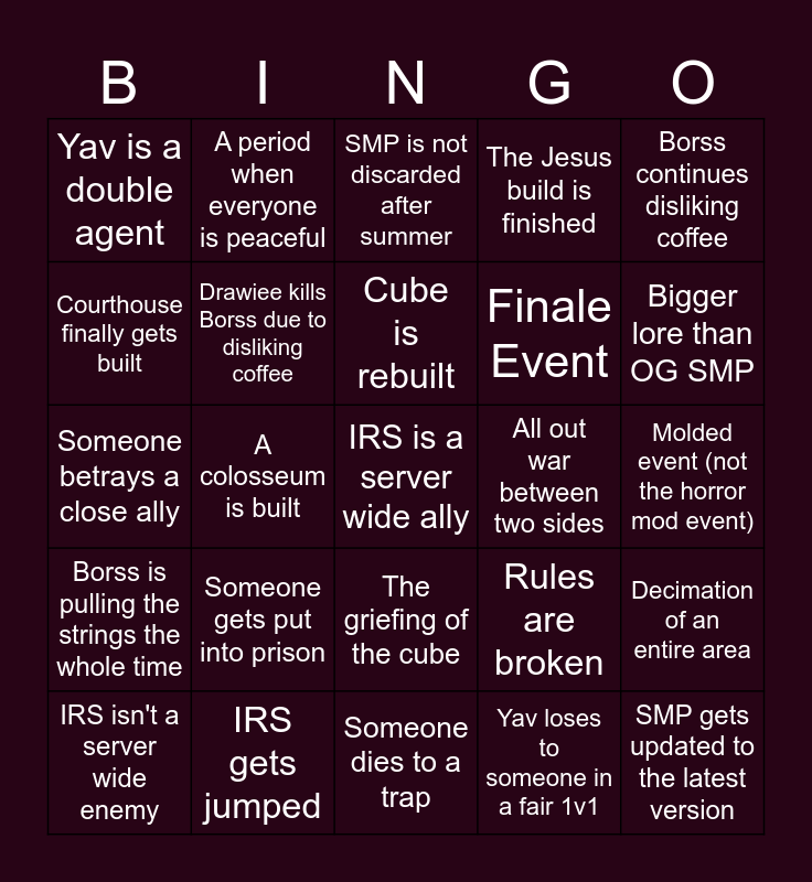 This bingo card has a free space and 24 words: Someone gets put into prison, IRS gets jumped, Cube is rebuilt, IRS isn't a server wide enemy, Borss continues disliking coffee, Yav is a double agent, Courthouse finally gets built, A period when everyone is peaceful, All out war between two sides, The griefing of the cube, Finale Event, Someone betrays a close ally, Rules are broken, Decimation of an entire area, Drawiee kills Borss due to disliking coffee, Yav loses to someone in a fair 1v1, Molded event (not the horror mod event), SMP is not discarded after summer, Bigger lore than OG SMP, A colosseum is built, SMP gets updated to the latest version, Borss is pulling the strings the whole time, The Jesus build is finished and Someone dies to a trap.