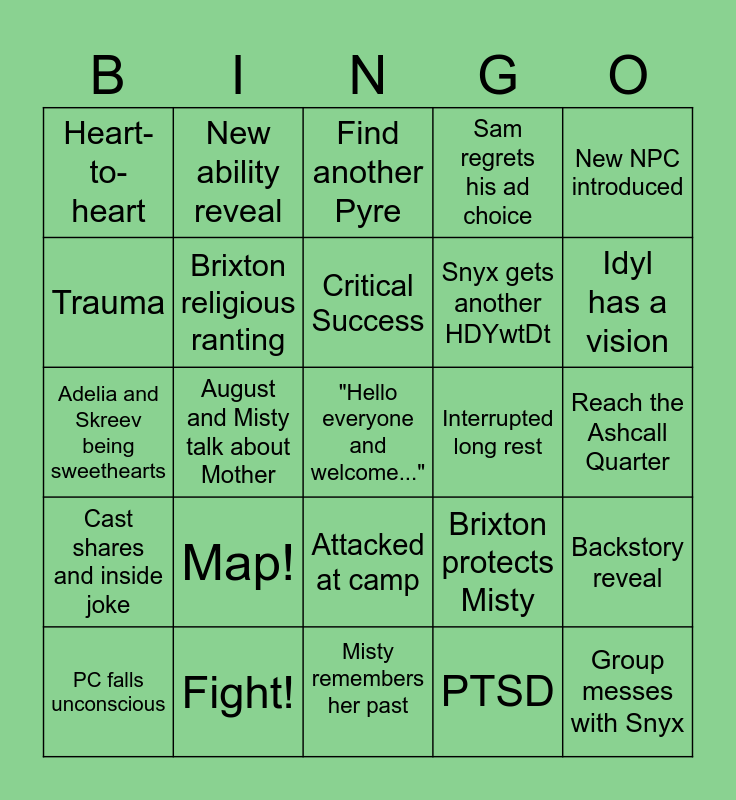 This bingo card has a free space and 24 words: Map!, Fight!, Critical Success, PC falls unconscious, New NPC introduced, Heart-to-heart, Trauma, New ability reveal, Interrupted long rest, Attacked at camp, Snyx gets another HDYwtDt, Adelia and Skreev being sweethearts, Brixton protects Misty, Backstory reveal, Brixton religious ranting, PTSD, Reach the Ashcall Quarter, Find another Pyre, Idyl has a vision, August and Misty talk about Mother, Group messes with Snyx, Cast shares and inside joke, Sam regrets his ad choice and Misty remembers her past.