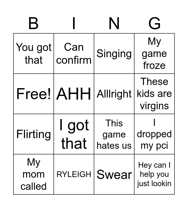This bingo card has 16 words: RYLEIGH, I dropped my pci, Singing, You got that, Flirting, Can confirm, This game hates us, Swear, Free!, AHH, My mom called, My game froze, I got that, These kids are virgins, Alllright and Hey can I help you just lookin.