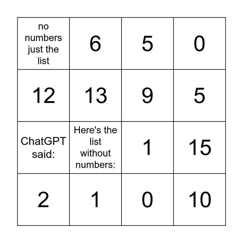 This bingo card has 47 words: 3, 2, 7, 10, 16, 11, 6, 36, 13, 4, 9, 0, 8, 30, 25, 18, 5, 1, 20, 12, 15, 24, no numbers just the list, ChatGPT said:, ChatGPT, Here's the list without numbers:, 3, 2, 7, 10, 16, 11, 6, 36, 4, 9, 0, 8, 30, 25, 18, 5, 1, 20, 12, 15 and 24.