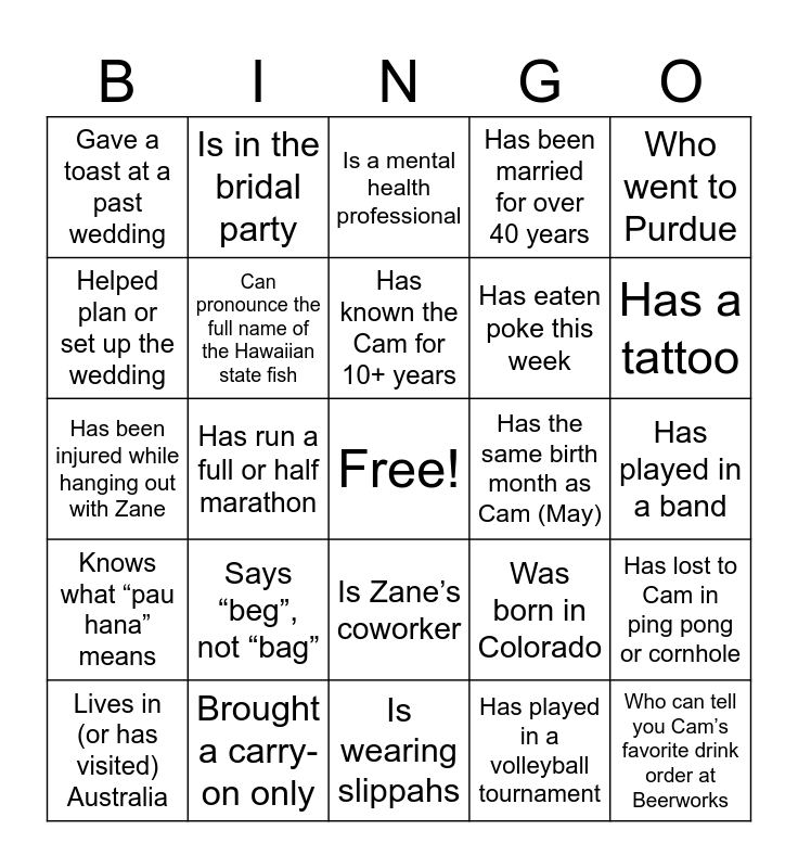 This bingo card has a free space and 42 words: Has known Zane for 10+ years, Has known the Cam for 10+ years, Is a nurse, Says “beg”, not “bag”, Has played in a volleyball tournament, Has lost to Cam in ping pong or cornhole, Who can tell you Cam’s favorite drink order at Beerworks, Was born in Minnesota, Is a mental health professional, Is Zane’s coworker, Has played in a band, Has a tattoo, Has run a full or half marathon, Who went to Purdue, Has gone spearfishing, Was born in Colorado, Has spent over $200 on a single LEGO set, Has been injured while hanging out with Zane, Traveled less than 5 miles for the wedding, Is in the bridal party, Helped plan or set up the wedding, Has changed Cam’s diaper, Has changed Zane’s diaper, Gave a toast at a past wedding, Was born in Hawaii, Has surfed in Hawaii, Has eaten poke this week, Hiked a trail on Oahu this trip, Has visited more than 2 Hawaiian islands, Can sing the chorus of a Twin Fin song, Has been to more than five Wicked Reef shows, Knows what “pau hana” means, Can pronounce the full name of the Hawaiian state fish, Is wearing slippahs, Has visited Hawaii more than 5 times, Lives in (or has visited) Australia, Brought a carry-on only, Has the same birth month as Cam (May), Has the same birth month as Zane (June), Has been to more than 10 weddings, Has been married for over 40 years and This is their first wedding.