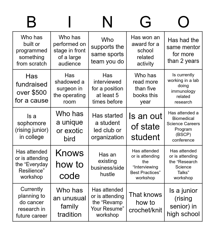 This bingo card has 39 words: Currently planning to pursue an MD/PhD, Has experience as an EMT/Nursing Assistant/Patient Care Technician, Has attended the ABRCMS, SACNAS, or NESS conference, Has shadowed a surgeon in the operating room, Currently planning to do cancer research in future career, Has an existing business/side hustle, Has interviewed for a position at least 5 times before, Has more than 100 connections on LinkedIn, Has had the same mentor for more than 2 years, Has attended or is attending the “Everyday Resilience” workshop, Who has a unique or exotic bird, Has won an award for a school related activity, Has started a student led club or organization, Has attended a Biomedical Science Careers Program (BSCP) conference, Is an out of state student, Knows how to code, Who has lived in more than two different cities., Who has built or programmed something from scratch, Has participated in a volunteer or community service project, Has attended or is attending the “Interviewing Best Practices” workshop, Has fundraised over $500 for a cause, Has attended or is attending the “Revamp Your Resume” workshop, Who has read more than five books this year, Is currently working in a lab doing immunology related research, Whose birthday is in the month of July, Has posted on LinkedIn in the last 2 weeks, Is a junior (rising senior) in high school, Who has met a celebrity or public figure, Who has tried an extreme sport or adventure activity, Who has performed on stage in front of a large audience, Who has binge-watched an entire series in one weekend, Whose favorite subject is Math, Who supports the same sports team you do, Who has an unusual family tradition, That knows how to crochet/knit, Is not in the same program as you, Has attended or is attending the “Research Science Talks” workshop, Is a sophomore (rising junior) in college and Is currently working in a dry lab.
