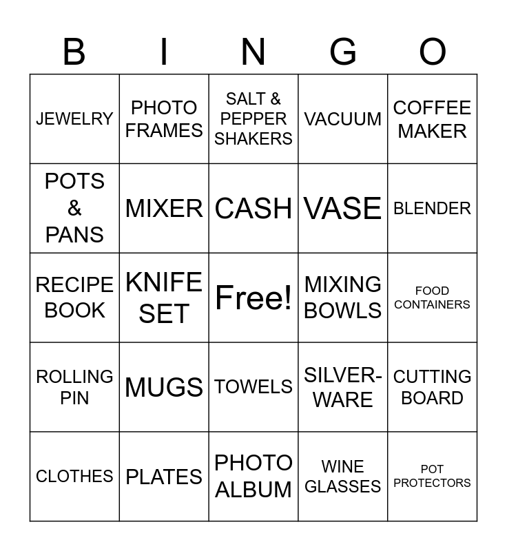 This bingo card has a free space and 24 words: MUGS, PLATES, CASH, CLOTHES, COFFEE MAKER, JEWELRY, POTS & PANS, PHOTO FRAMES, MIXING BOWLS, TOWELS, VASE, RECIPE BOOK, SILVER-WARE, CUTTING BOARD, MIXER, WINE GLASSES, FOOD CONTAINERS, SALT & PEPPER SHAKERS, BLENDER, KNIFE SET, POT PROTECTORS, ROLLING PIN, VACUUM and PHOTO ALBUM.