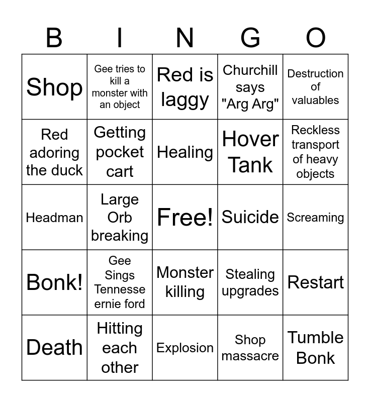 This bingo card has a free space and 24 words: Gee Sings Tennesse ernie ford, Hitting each other, Healing, Death, Destruction of valuables, Shop, Red adoring the duck, Gee tries to kill a monster with an object, Suicide, Monster killing, Hover Tank, Headman, Stealing upgrades, Restart, Getting pocket cart, Shop massacre, Screaming, Red is laggy, Reckless transport of heavy objects, Large Orb breaking, Tumble Bonk, Bonk!, Churchill says "Arg Arg" and Explosion.