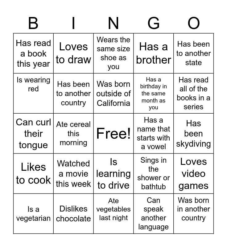 This bingo card has a free space and 49 words: Has a pet, Was born in another country, Lives with more than 3 people, Ate vegetables last night, Watched a movie this week, Has a sister, Loves to draw, Is allergic to cats, Is wearing red, Speaks another language, Has been to another country, Has a brother, Loves video games, Sings in the shower or bathtub, Plays an instrument, Loves to play sports, Was born outside of California, Has a name that starts with a vowel, Can whistle, Has been to another state, Ate cereal this morning, Can speak another language, Has read a book this year, Has a birthday in the same month as you, Is the youngest child, Has read all of the books in a series, Is a vegetarian, Is a twin or triplet, Is learning to drive, Likes to cook, Is the oldest child, Is left-handed, Has been in a play, Has eaten escargot (snails), Dislikes chocolate, Is taller than a parent, Has broken a bone, Knows how to ice skate, Has been skydiving, Has their toenails painted, Has been on a train, Enjoys math, Went to a National Park this summer, Doesn't have pierced ears, Can curl their tongue, Wears the same size shoe as you, Doesn't use social media, Flosses their teeth every day and Can name all 7 dwarves.