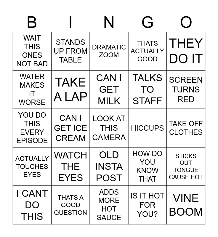This bingo card has a free space and 24 words: WATCH THE EYES, THATS A GOOD QUESTION, CAN I GET MILK, I CANT DO THIS, THEY DO IT, WAIT THIS ONES NOT BAD, WATER MAKES IT WORSE, STANDS UP FROM TABLE, HICCUPS, OLD INSTA POST, TALKS TO STAFF, YOU DO THIS EVERY EPISODE, HOW DO YOU KNOW THAT, STICKS OUT TONGUE CAUSE HOT, TAKE A LAP, IS IT HOT FOR YOU?, TAKE OFF CLOTHES, DRAMATIC ZOOM, SCREEN TURNS RED, CAN I GET ICE CREAM, VINE BOOM, ACTUALLY TOUCHES EYES, THATS ACTUALLY GOOD and ADDS MORE HOT SAUCE.
