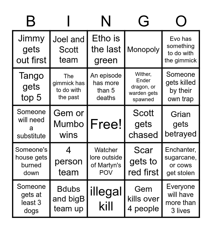 This bingo card has a free space and 24 words: 4 person team, Bdubs and bigB team up, An episode has more than 5 deaths, Someone gets at least 3 dogs, Evo has something to do with the gimmick, Jimmy gets out first, Tango gets top 5, Joel and Scott team, Scott gets chased, Watcher lore outside of Martyn's POV, Wither, Ender dragon, or warden gets spawned, Someone will need a substitute, Scar gets to red first, Enchanter, sugarcane, or cows get stolen, The gimmick has to do with the past, Gem kills over 4 people, Grian gets betrayed, Etho is the last green, Someone gets killed by their own trap, Gem or Mumbo wins, Everyone will have more than 3 lives, Someone's house gets burned down, Monopoly and illegal kill.