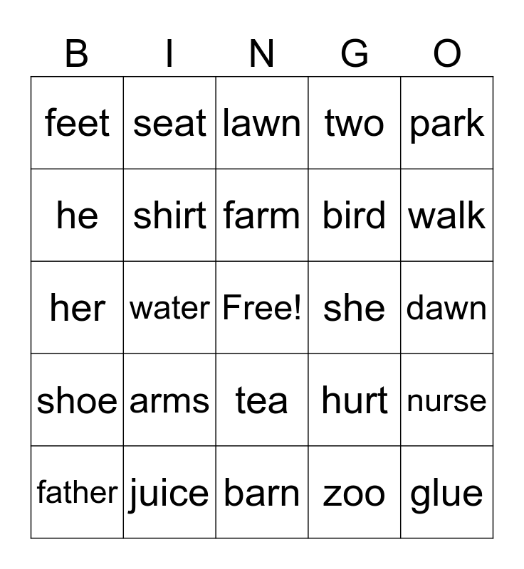 This bingo card has a free space and 25 words: arms, barn, farm, father, park, feet, he, seat, she, tea, bird, her, hurt, nurse, shirt, ball, dawn, lawn, walk, water, glue, juice, shoe, two and zoo.