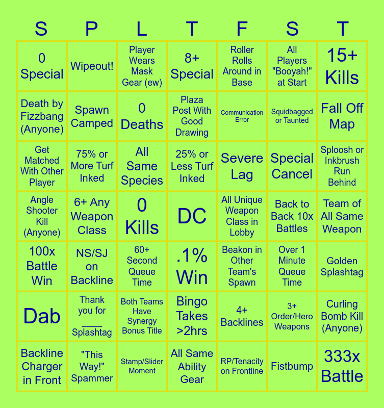 This bingo card has a free space and 48 words: 4+ Backlines, Squidbagged or Taunted, All Same Ability Gear, 6+ Any Weapon Class, All Same Species, Team of All Same Weapon, Wipeout!, "This Way!" Spammer, All Players "Booyah!" at Start, .1% Win, 15+ Kills, 8+ Special, Special Cancel, Severe Lag, Dab, Back to Back 10x Battles, Death by Fizzbang (Anyone), Fall Off Map, 3+ Order/Hero Weapons, Roller Rolls Around in Base, Communication Error, 0 Kills, 0 Special, Spawn Camped, Curling Bomb Kill (Anyone), 0 Deaths, Sploosh or Inkbrush Run Behind, Backline Charger in Front, 25% or Less Turf Inked, 75% or More Turf Inked, Fistbump, All Unique Weapon Class in Lobby, Golden Splashtag, Thank you for ____ Splashtag, Angle Shooter Kill (Anyone), Beakon in Other Team's Spawn, Over 1 Minute Queue Time, Get Matched With Other Player, 60+ Second Queue Time, Both Teams Have Synergy Bonus Title, 100x Battle Win, 333x Battle, Player Wears Mask Gear (ew), Stamp/Slider Moment, Plaza Post With Good Drawing, Bingo Takes >2hrs, NS/SJ on Backline and RP/Tenacity on Frontline.