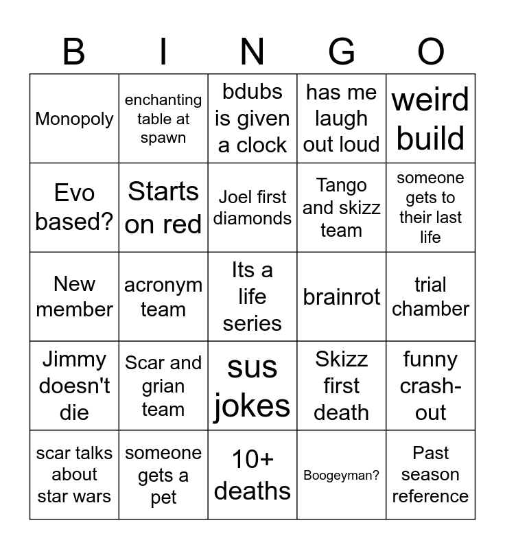 This bingo card has a free space and 24 words: Scar and grian team, someone gets a pet, Joel first diamonds, scar talks about star wars, weird build, Monopoly, Evo based?, enchanting table at spawn, brainrot, sus jokes, Tango and skizz team, New member, Skizz first death, funny crash-out, Starts on red, Boogeyman?, trial chamber, bdubs is given a clock, someone gets to their last life, acronym team, Past season reference, Jimmy doesn't die, has me laugh out loud and 10+ deaths.