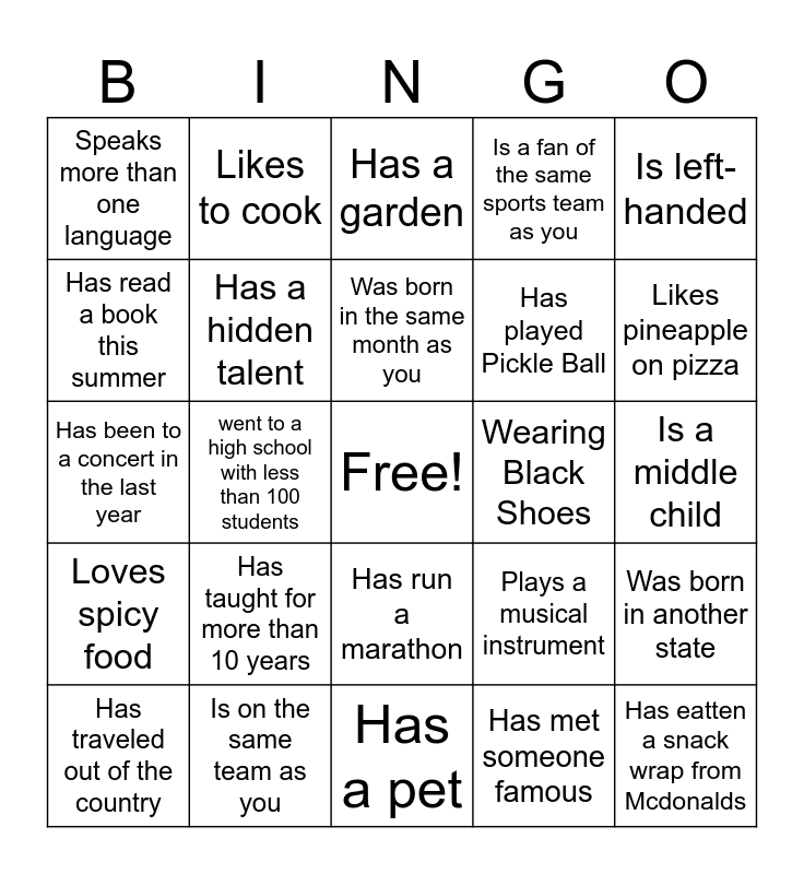 This bingo card has a free space and 25 words: Has taught for more than 10 years, Has a pet, Was born in the same month as you, Has traveled out of the country, Is left-handed, Speaks more than one language, Has read a book this summer, Likes to cook, Wearing Black Shoes, Has run a marathon, Has played Pickle Ball, Has been to a concert in the last year, Plays a musical instrument, Was born in another state, Has a hidden talent, Is a morning person, Is a middle child, Has a garden, Likes pineapple on pizza, went to a high school with less than 100 students, Has eatten a snack wrap from Mcdonalds, Is on the same team as you, Loves spicy food, Is a fan of the same sports team as you and Has met someone famous.